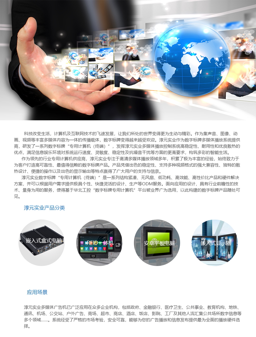淳元實業(yè)多媒體廣告機已廣泛應(yīng)用在眾多企業(yè)機構(gòu),包括政府、金融銀行、醫(yī)療衛(wèi)生、公共事業(yè)、教育機構(gòu)、地鐵、通訊、機場、公交站、戶外廣告、商場、超市、商店、酒店、飯店、影院、工廠及其他人流匯集公共場所數(shù)字信息等多個領(lǐng)域……。系統(tǒng)經(jīng)受了嚴格的市場考驗,安全可靠,能夠為您的廣告播放和信息發(fā)布提供最為全面的播放硬件選擇。
